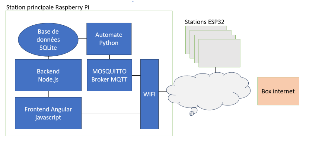 Les stations publient les données des capteurs sous forme de messages MQTT vers le broker MOSQUITTO; l’automate souscrit à ces messages, et effectue un traitement sur les données, il enregistre les valeurs pertinentes en base de données.
